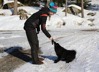 Eka treeni vedettiin omatoimisesti seurailulla, joka meni suht ok. Otin pitkästä aikaa juoksupätkiä ja sain sivulla juoksevan kontaktittoman koiran, hups! Muutaman korjauskehotuksen jälkeen pienet juoksupätkät meni myös ok kontaktilla. Kentän pohja oli vähän haasteellinen, luminen ja möykkyinen, joka tuntui vähän Indyä häiritsevän. Oli myös hyvää häiriötä, kun kentällä tepasteli kolme muutakin koirakkoa samalla.